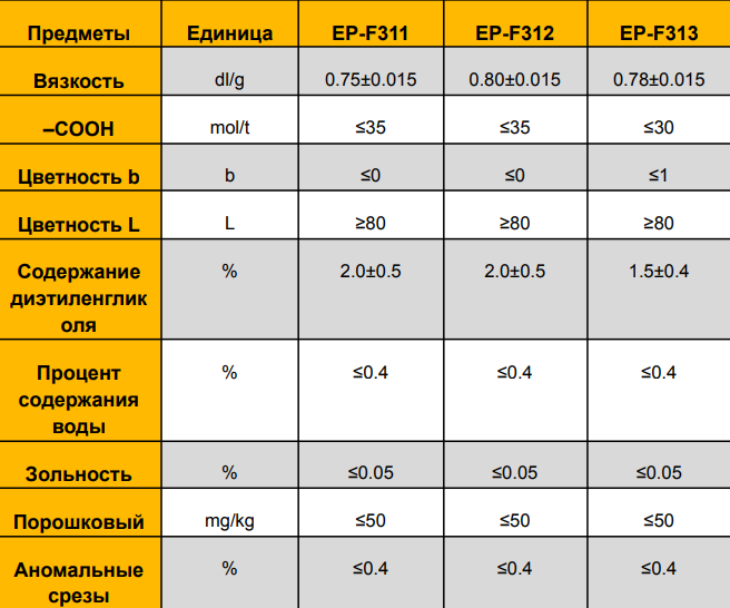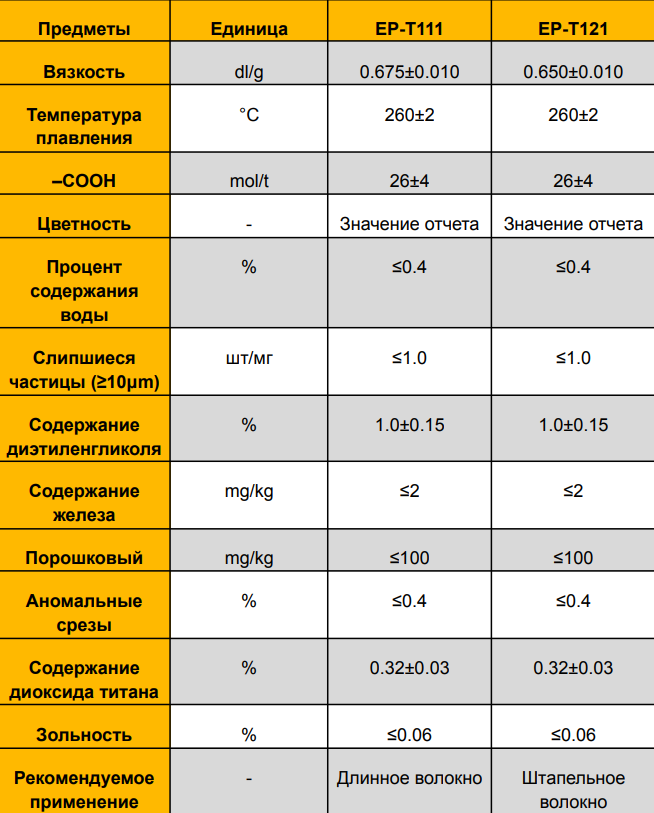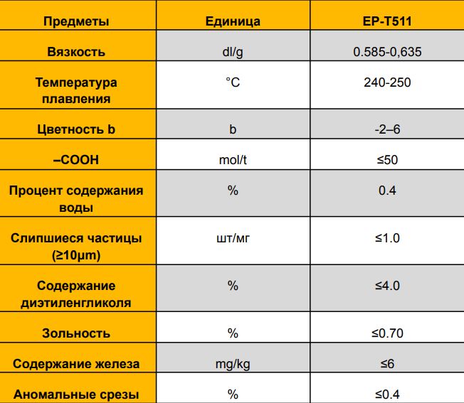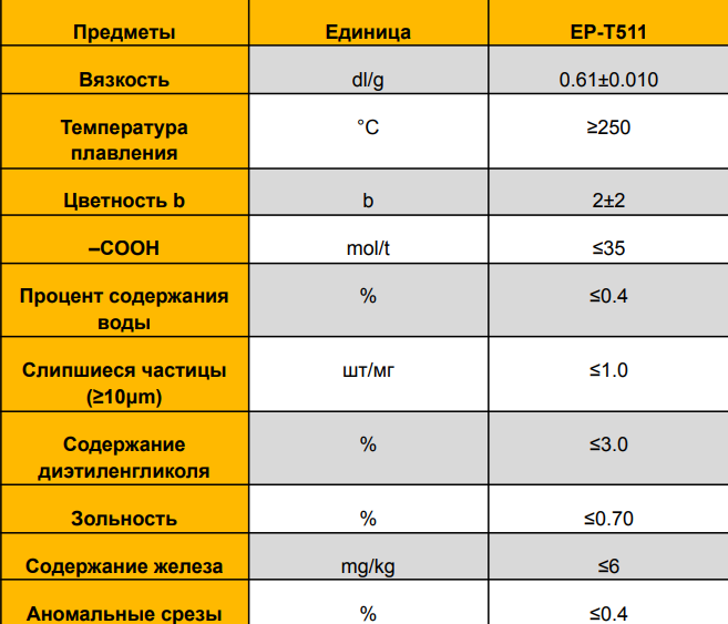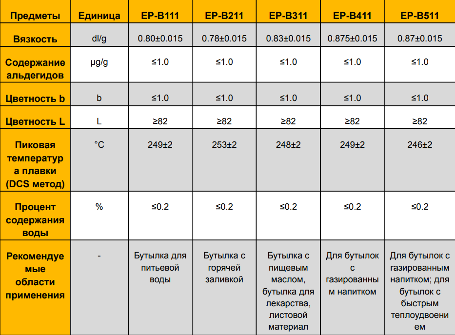 Полиэфирный гранулят EP-B111 для бутылок — это PET высокополимерный материал, который может использоваться в качестве упаковочного материала для питьевой воды, а также для стерильной заливки воды. Данный материал главным образом предназначен для чистой воды, минеральной воды, дистиллированной воды и т.д., также может использоваться для стерильной заливки напитков, в качестве упаковки для пищевых продуктов, таких как конфеты, сухофрукты и т.д., а также для косметики.